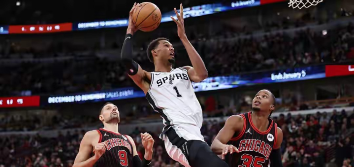 不过哈登能当选,也离不开效力于马刺的文班亚马的“衬托”,这位联盟未来门面在马刺对阵公牛的比赛里,打出了堪称“天外来物”级别的表现。这场客场对决一波三折,马刺首节轰下34分取得领先,第二节却被公牛打出38-29的反击,半场结束反而落后1分。第三节公牛乘胜追击,把分差扩大到9分,第四节初更是领先13分,看起来胜利已经稳了。