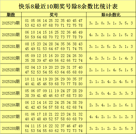 福彩快乐8第2025288期开奖回顾:04 11 15 16 22 32 37 46 47 49 51 53 54 55 60 62 70 72 73 74,其中奖号除8余数比为3:2:1:2:2:2:5:3。