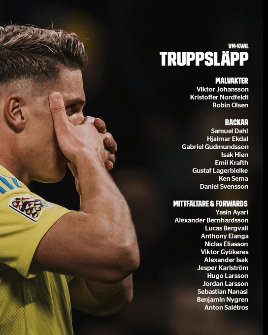 瑞典大名单: 哲凯赖什伊萨克领衔, 埃兰加贝里瓦尔在列