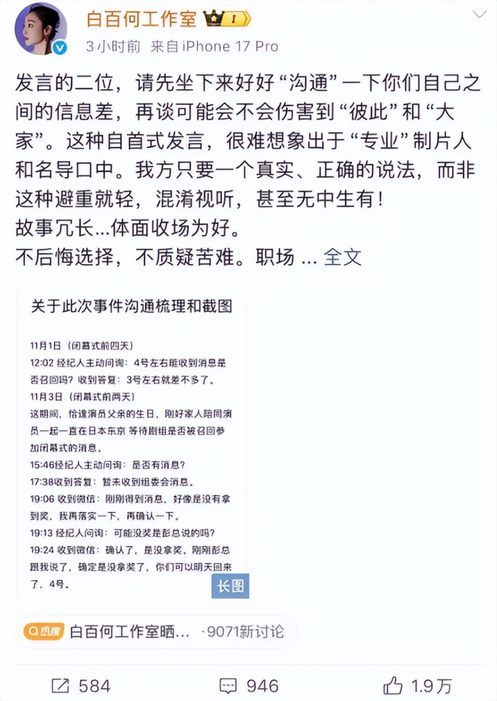 在这件事情爆发之后,白百何并没有立即出来进行解释或道歉,而是让一切继续发酵。直到王传君获奖的几天后,她才“澄清”了自己的立场。
