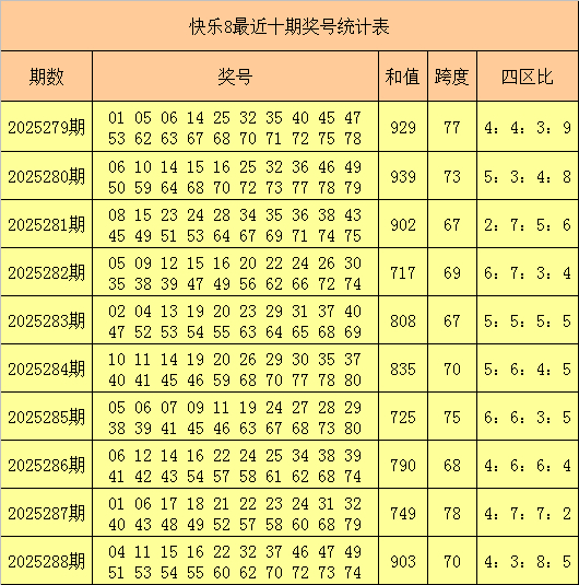 快乐8第2025288期奖号开出:04 11 15 16 22 32 37 46 47 49 51 53 54 55 60 62 70 72 73 74,其中奖号和值为903,跨度为70,四区比为4:3:8:5。