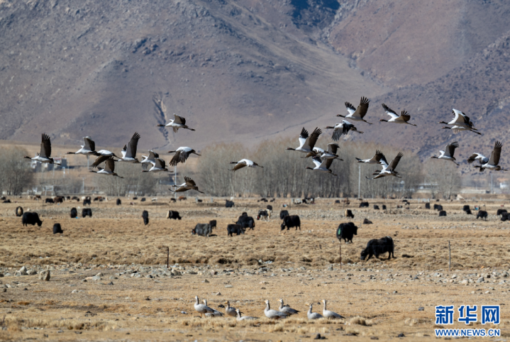 这是11月26日在西藏拉萨市林周县境内拍摄的黑颈鹤和斑头雁。新华网旦增努布摄